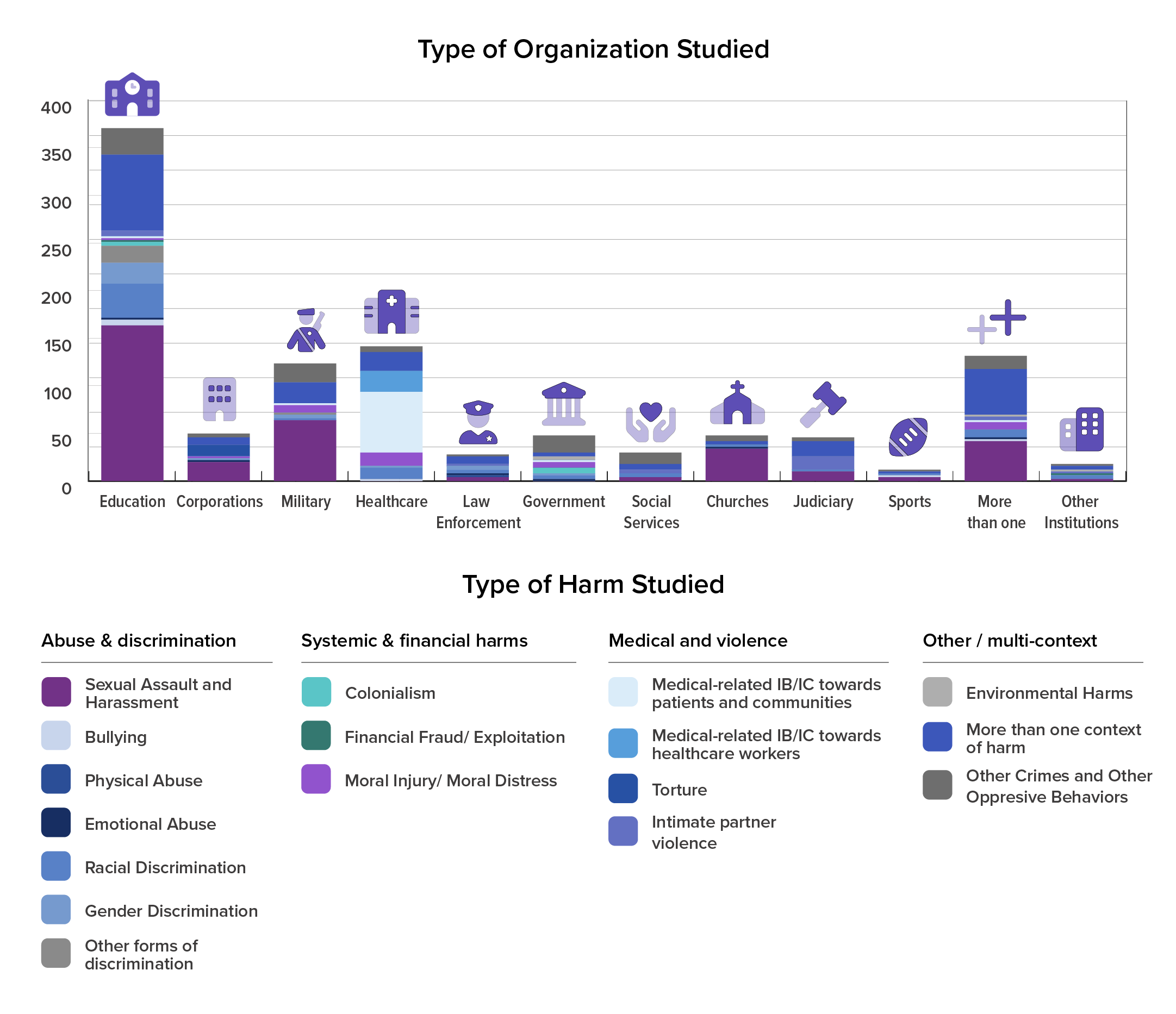 In this update, we have noted a broadening of research into new institutional categories and contexts of harm. While Education continues to be the most prominent category with 186 papers, the data has necessitated creating two new institutional categories. The first is Social Services, which now includes 15 papers that have a focus on institutions such as child protective services and foster care. The second is Sports, with six papers investigating athletic institutions that are primarily centered on the Larry Nasser cases. Additionally, while Sexual Assault and Harassment continues to be our most prominent context of harm with 174 papers, we have identified three additional distinct contexts: Colonialism, Environmental Harms, and Emotional Abuse. These additions reflect an increasing interdisciplinary awareness of how betrayal and courage operate across diverse institutional systems and contexts.